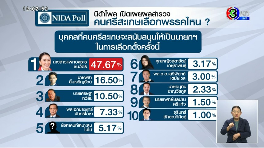 'นิด้าโพล' เผยผลสำรวจคนศรีสะเกษ เลือก 'อุ๊งอิ๊ง' อันดับ 1 'พิธา' อันดับ 2 'เศรษฐา' เบียด 'บิ๊กตู่' มาอันดับ 3