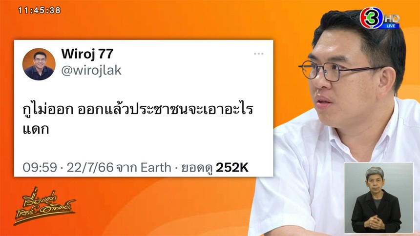 ประเด็นที่มีหลายคนบอกว่า ก้าวไกลต้องถอย ผมก็อยากพูดว่า “ออกแล้วประชาชนจะเอาอะไรแดก กูไม่ออก กูจะอยู่กับมึงนี่แหละ แต่เราจะอยู่แบบสุดปลายมือจริง ๆ สู้กับคนหน้าด้าน เราหน้าบางไม่ได้ คือ คนหน้าด้าน คนถ่อยเนี่ย เขาจะรู้สึกว่าวิญญูชนจะหน้าบาง แสดงสปิริตสิ ผมก็บอกว่า ไม่ ๆๆๆ กูไม่ออก ต่อให้ยีหัวเรา กูก็จะกอดมึงเอาไว้ ออกแล้วประชาชนจะเอาอะไรแดก”