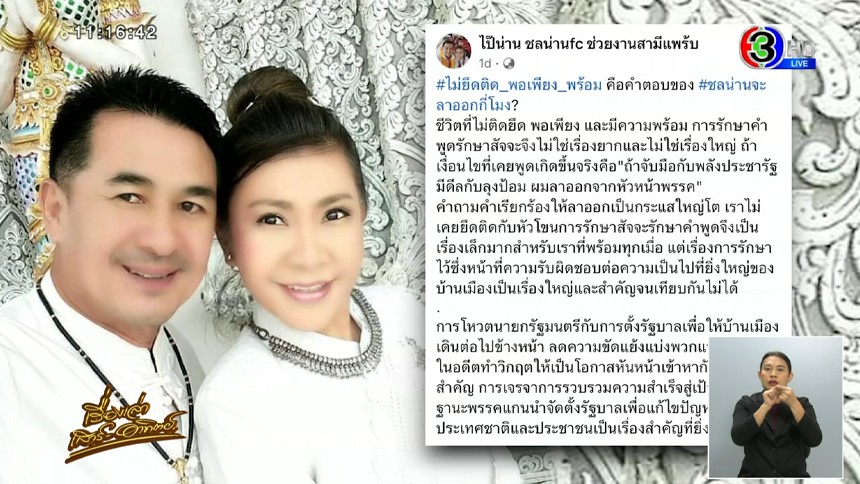 จากกรณีที่โลกออนไลน์ผุดแฮชแท็ก #ชลน่านลาออกกี่โมง ติดเทรนด์ทวิตเตอร์ต่อเนื่องนั้น ล่าสุด ผู้ใช้เฟซบุ๊ก 'ไป๊น่าน ชลน่านfc ช่วยงานสามีแพร้บ' ซึ่งเป็นเฟซบุ๊กของ คุณนวลสกุล บํารุงพงษ์ ภรรยาของ นพ.ชลน่าน ศรีแก้ว หัวหน้าพรรคเพื่อไทย ได้โพสต์เฟซบุ๊กชี้แจงกรณีดังกล่าว ระบุว่า