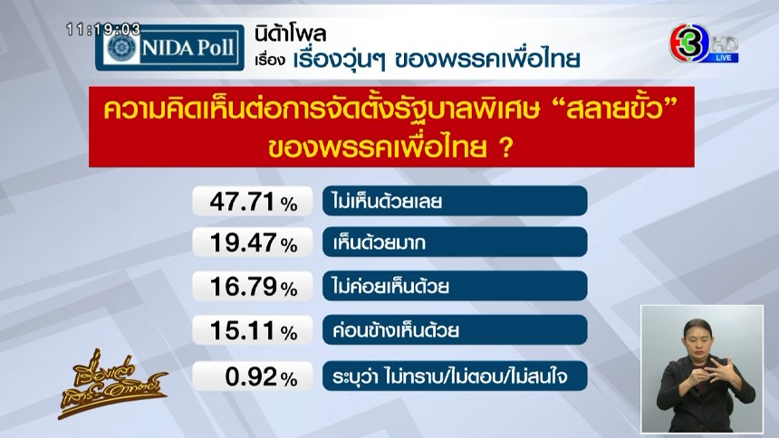 'นิด้าโพล' เผยผลสำรวจ 'เรื่องวุ่นๆของเพื่อไทย' ส่วนใหญ่ไม่เห็นด้วย ตั้งรัฐบาลพิเศษสลายขั้ว