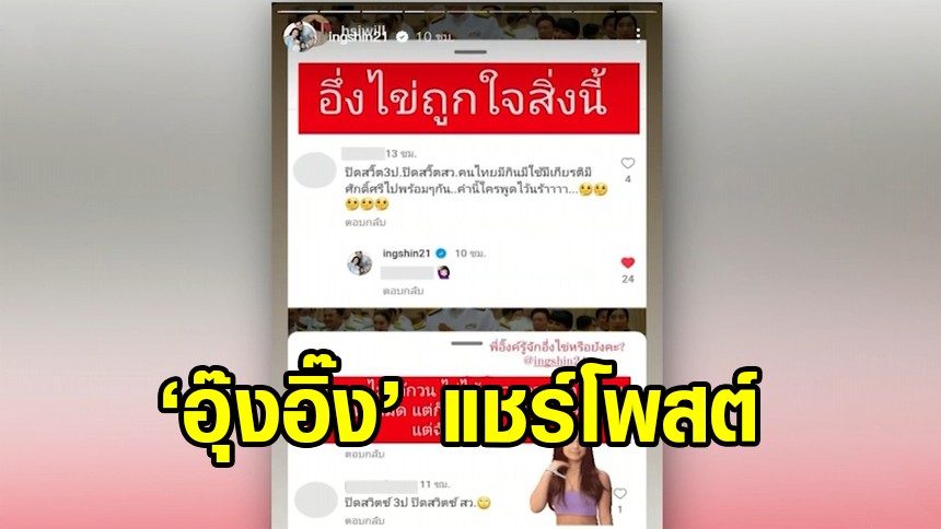 หลังเรื่องนี้เป็นประเด็นร้อนในโซเชียล อุ๊งอิ๊งก็แชร์ภาพข่าวนี้ของ 3PlusNews และเขียนข้อความว่า “เทวดาในใจเก๊าาา” พร้อมอีโมจิเทวดา อิโมจิเอามือปิดปาก และอีกโพสต์ในไอจีสตอรี่ อุ๊งอิ๊งแชร์มาจากโพสต์ที่มีคนคอมเมนต์เรื่องนี้ไว้ว่า “นี่สิน้องกรู...” และเขียนข้อความว่า “เทวดาของลูกก็คือพ่องิ” พร้อมอิโมจิเอามือปิดปาก