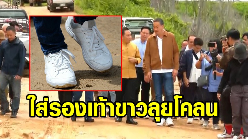 นายกรัฐมนตรีในขณะได้เดินทางมาถึงเขื่อน แม่กวงอุดมธารา โดยได้เดินเท้าลุยโคลนจากด้านบนลงมาด้านล่าง ซึ่งรองเท้าของนายกรัฐมนตรีเป็นสีขาว จากนั้นได้สอบถามผู้ว่าราชการจังหวัดถึงแนวทางการบริหารจัดการน้ำ