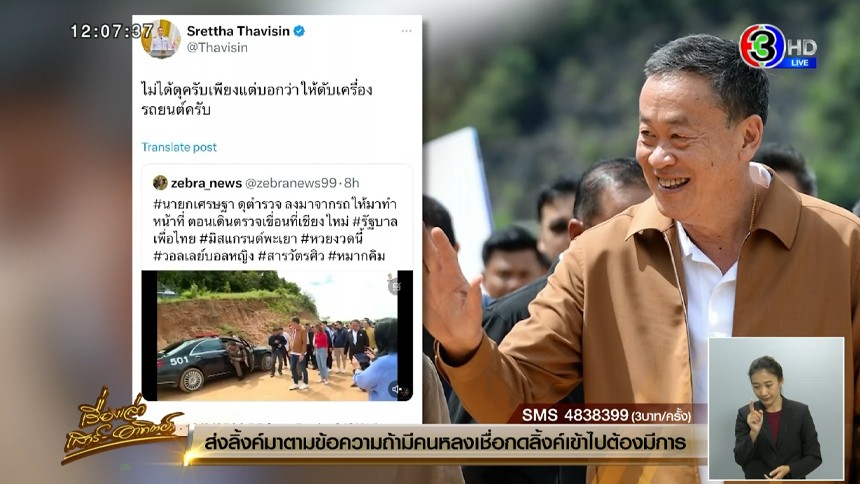 ขณะที่เมื่อเวลา 12.35 น. ผู้ใช้งาน X (Twitter) รายหนึ่ง ได้โพสต์คลิปวิดีโอของนายเศรษฐา ทวีสิน นายกรัฐมนตรี ขณะลงพื้นที่บริเวณสันเขื่อน จังหวัดเชียงใหม่ โดยช่วงที่นายเศรษฐาเดินผ่านรถตำรวจได้หยุด ชี้นิ้ว และพูดคุยกับตำรวจที่อยู่บนรถ ก่อนที่ตำรวจคนดังกล่าวจะลงจากรถ