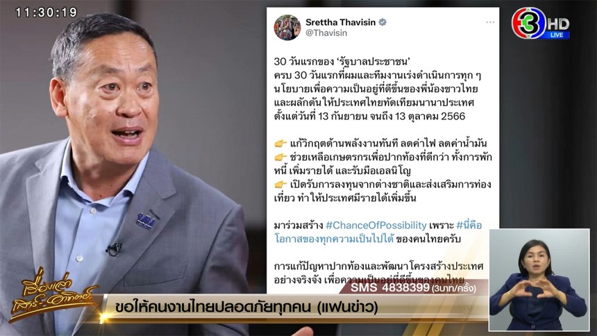 ‘เศรษฐา’ โพสต์ 30 วันแรก ทำแล้ว 3 ผลงานใหญ่ แก้วิกฤตพลังงาน-พักหนี้-ส่งเสริมการท่องเที่ยว