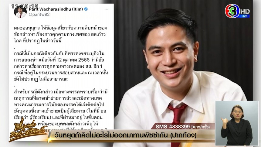 ด้าน นายพริษฐ์ วัชรสินธุ สส.บัญชีรายชื่อ รองโฆษกพรรคก้าวไกล ทวิตข้อความผ่าน x ชี้แจงกรณีนี้ว่า ผมขออนุญาตให้ข้อมูลเกี่ยวกับความคืบหน้าของข้อกล่าวหาเรื่องการคุกคามทางเพศของ สส.ก้าวไกล ที่ปรากฎในข่าววันนี้