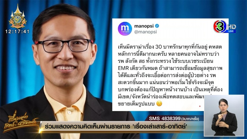 ด้าน ศ.นพ.มานพ พิทักษ์ภากร หัวหน้าศูนย์วิจัยการแพทย์แม่นยำ คณะแพทยศาสตร์ ศิริราชพยาบาล ได้โพสต์ข้อความผ่าน x @manopsi ได้แสดงความคิดเห็นในประเด็นดังกล่าวว่า “เห็นมีดราม่าเรื่อง 30 บาทรักษาทุกที่กันอยู่ คหสต. หลักการนี้ดีมากนะครับ หลายคนอาจไม่ทราบว่า รพ. สังกัด สธ. ทั้งกระทรวงใช้ระบบเวชระเบียน EMR เดียวกันหมด ถ้าสามารถเชื่อมข้อมูลสุขภาพได้ดีและทั่วถึงจะเอื้อต่อการส่งต่อผู้ป่วยต่าง รพ. สะดวกขึ้นมาก แน่นอนว่าพอเริ่มใช้จริงจะมีจุดบกพร่องต้องแก้ปัญหาหน้างานบ้าง เป็นเหตุที่ต้องมีเขต/จังหวัดนำร่องเพื่อทดสอบและพัฒนาก่อนขยายเต็มรูปแบบ”