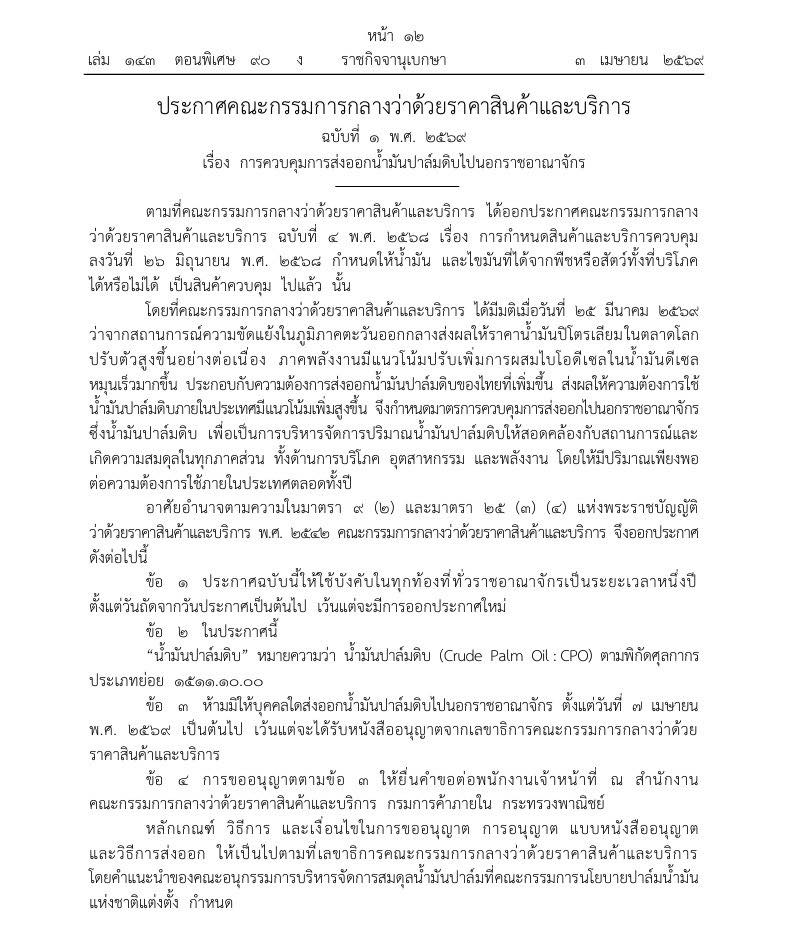 วันที่ 5 เมษายน 2596 เว็บไซต์ราชกิจจานุเบกษา เผยแพร่ ประกาศคณะกรรมการกลางว่าด้วยราคาสินค้าและบริการ ฉบับที่ 1 พ.ศ. 2569 เรื่องการควบคุมการส่งออกน้ำมันปาล์มดิบไปนอกราชอาณาจักร ความว่า