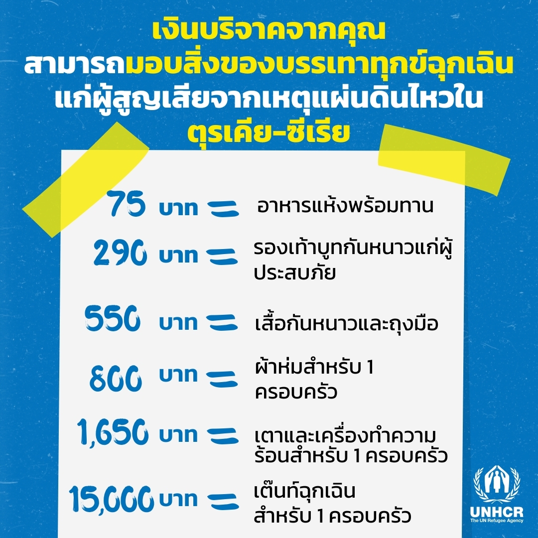 เจ้าหน้าที่ของ UNHCR อยู่ในพื้นที่ประเทศซีเรียและตุรเคีย เพื่อรับมือกับความต้องการในพื้นที่ และพร้อมสนับสนุนรัฐบาลในการมอบความช่วยเหลือ เราได้เตรียมเสบียงเพื่อลำเลียงเข้าพื้นที่ต่างๆ รวมถึงการจัดหาทรัพยากรต่างๆ เพิ่มเติม