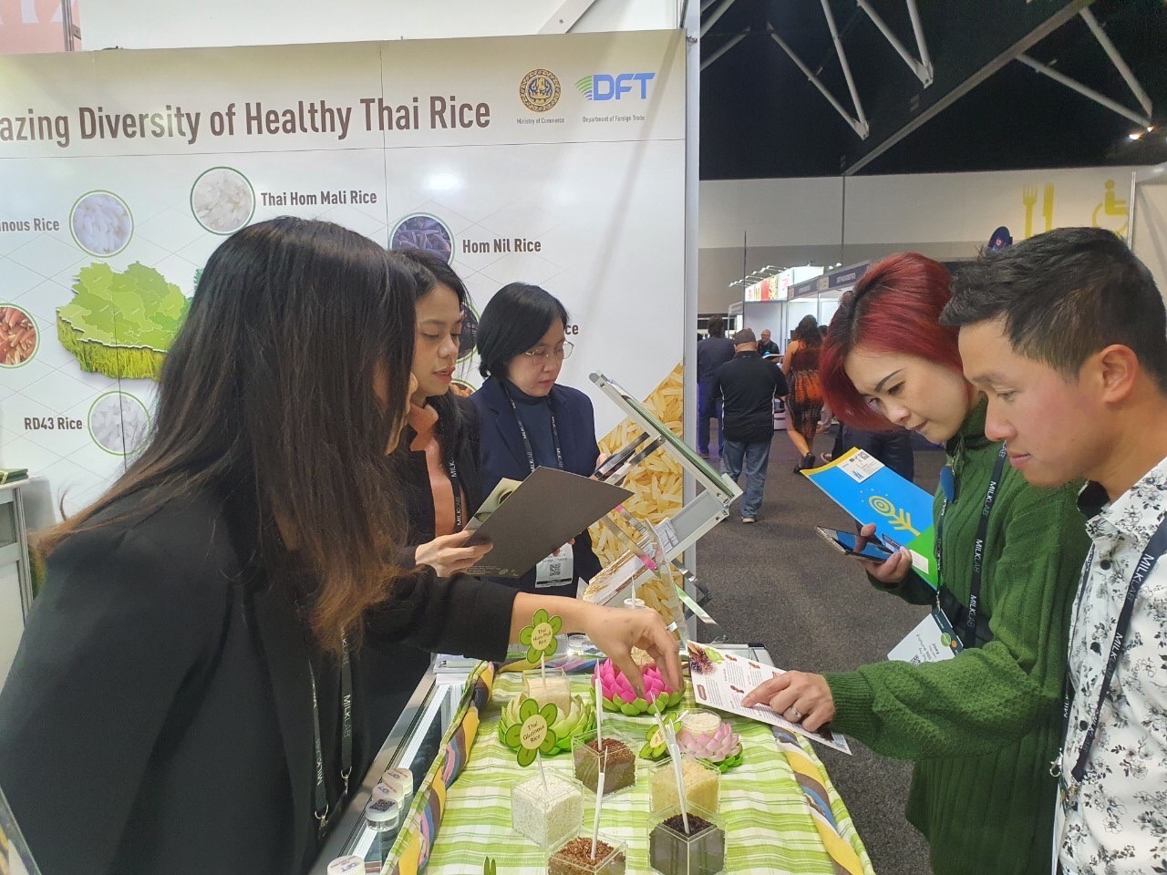 กรมการค้าต่างประเทศได้จัดนิทรรศการให้ความรู้เกี่ยวกับความหลากหลายของข้าวไทยควบคู่กับเครื่องหมายรับรองข้าวหอมมะลิไทย และจัดแสดงตัวอย่างข้าวไทยชนิดต่างๆ ได้แก่ ข้าวหอมมะลิไทย ข้าวหอมไทย ข้าวขาว ข้าวนึ่ง ข้าวเหนียว ข้าวกล้อง และได้มีการนำเสนอข้าวคุณลักษณะพิเศษของไทยที่มีคุณค่าทางโภชนาการสูงให้เป็นที่รู้จักมากยิ่งขึ้น อาทิ ข้าวไรซ์เบอร์รี่ ข้าวหอมนิล ข้าวกล้องหอมมะลิแดง ข้าวสังข์หยด และข้าว กข43 โดยคูหาประชาสัมพันธ์ของกรมการค้าต่างประเทศได้รับการตอบรับเป็นอย่างดีจากผู้ประกอบการในออสเตรเลีย และมีผู้สนใจเข้าเยี่ยมชมคูหาตลอดการจัดงานกว่า 2,000 ราย โดยผู้เข้าร่วมงานให้ความสนใจและชื่นชอบในคุณภาพของข้าวหอมมะลิไทย และให้ความสนใจข้าวสีชนิดต่างๆ ของไทย อาทิ ข้าวไรซ์เบอร์รี่และข้าวหอมนิล ซึ่งเป็นข้าวที่มีสารต้านอนุมูลอิสระและมีคุณค่าทางโภชนาการสูงเหมาะกับผู้บริโภคในปัจจุบันที่ให้ความสำคัญกับสุขภาพมากขึ้น