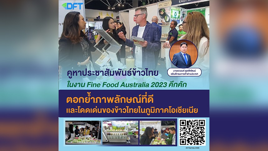 กรมการค้าต่างประเทศจัดกิจกรรมประชาสัมพันธ์ภาพลักษณ์ข้าวไทยในงานแสดงสินค้าอาหาร Fine Food Australia 2023 เพื่อสร้างความเชื่อมั่นในคุณภาพมาตรฐานและความปลอดภัย รวมทั้งตอกย้ำภาพลักษณ์ที่ดีและความโดดเด่นของข้าวไทยในภูมิภาคโอเชียเนีย