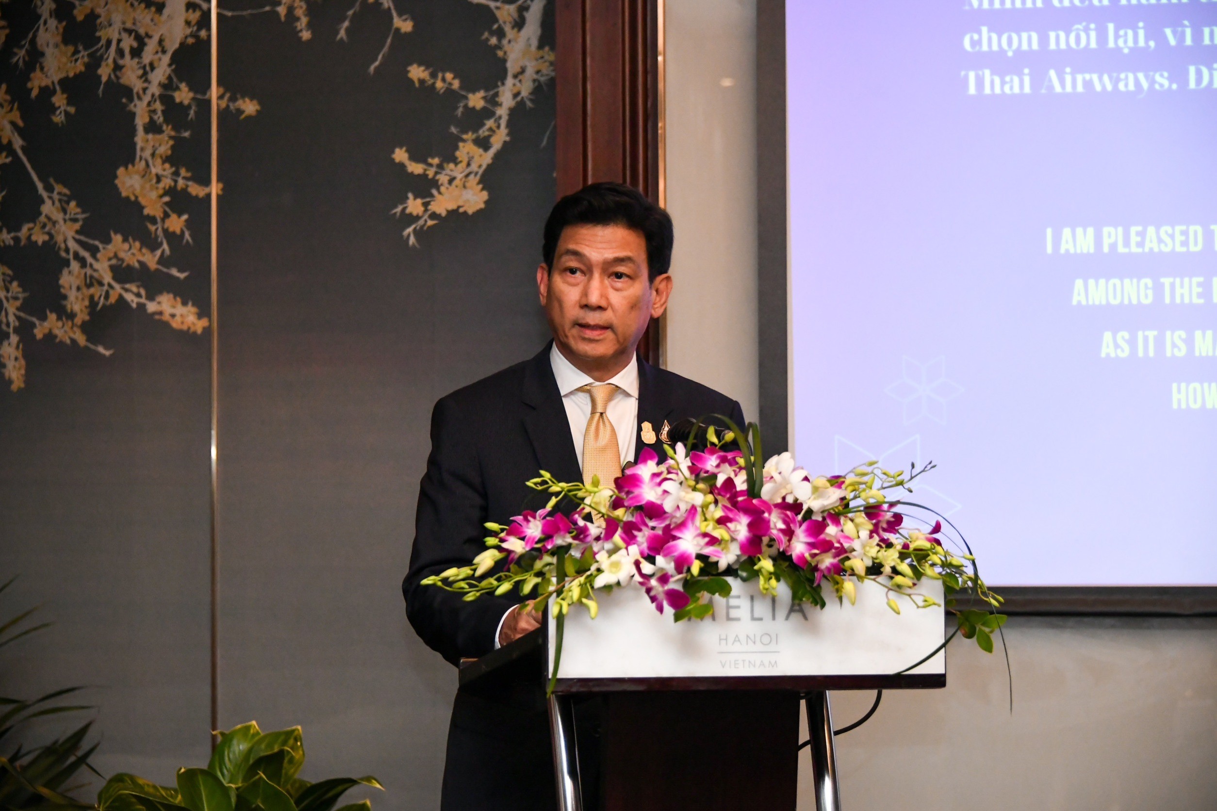 ซึ่งเมื่อปีที่แล้ว ประเทศไทยได้ต้อนรับนักท่องเที่ยวชาวเวียดนามมากกว่า 500,000 คน ขณะที่ชาวไทยไปเยือนเวียดนามมากกว่า 200,000 คน สำหรับปีนี้ตัวเลขนักท่องเที่ยวทั้งสองประเทศเพิ่มขึ้น และคาดว่าจะเพิ่มขึ้น 2 เท่าเมื่อเทียบกับปีก่อน ส่วนตัวรู้สึกยินดีที่ได้ทราบว่าเที่ยวบินขาเข้า และขาออกจากกรุงฮานอยและนครโฮจิมินห์ เป็นหนึ่งในเที่ยวบินระหว่างประเทศกลุ่มแรกๆ ที่การบินไทยเลือกกลับมาให้บริการอีกครั้ง เนื่องจากบริษัทกำลังดำเนินการฟื้นฟูธุรกิจอย่างต่อเนื่อง ปัจจัยเหล่านี้บ่งบอกถึงความสำคัญของเวียดนามต่อกลยุทธ์การเติบโตของการบินไทย