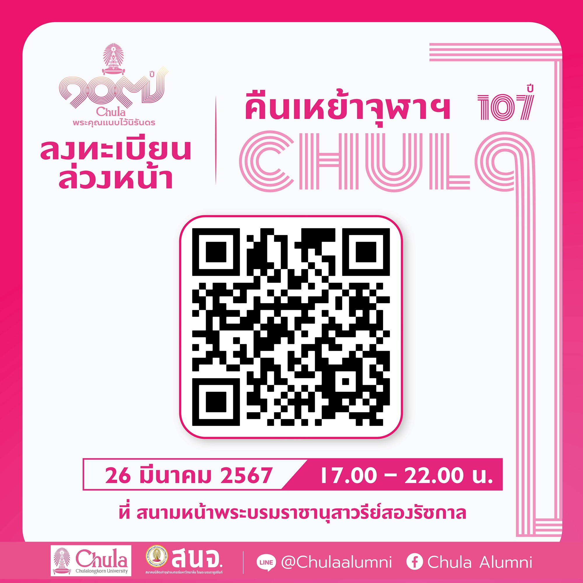 สมาคมนิสิตเก่าจุฬาลงกรณ์มหาวิทยาลัย ในพระบรมราชูปถัมภ์ (สนจ.) เตรียมจัดงานคืนเหย้า “๑๐๗ ปี จุฬาฯ พระคุณแนบไว้นิรันดร” เชิญชวนนิสิตเก่าและปัจจุบัน พร้อมใจกันสวมเสื้อสีชมพู เข้าร่วมงานโดยพร้อมเพรียงกัน เข้าฟรีไม่มีการจำหน่ายบัตร ในวันที่ 26 มีนาคม 2567 ณ สนามหน้าพระบรมราชานุสาวรีย์สมเด็จพระปิยมหาราชและสมเด็จพระมหาธีรราชเจ้า จุฬาลงกรณ์มหาวิทยาลัย