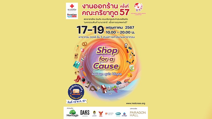 วันที่ 17 - 19 พฤษภาคม 2567 เวลา 10.00 - 20.00 น. ณ พารากอน ฮอลล์ ชั้น 5 สยามพารากอน และ www.iredcross.org รายได้โดยเสด็จพระราชกุศลบำรุงสภากาชาดไทย ร่วมลุ้นรางวัลจากสลากคณะภริยาทูต ซื้อก่อนใครลุ้นก่อนใครได้ที่ https://bit.ly/SP_DPC2024_RAFFLE