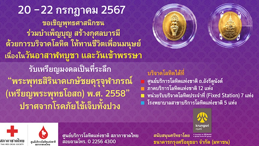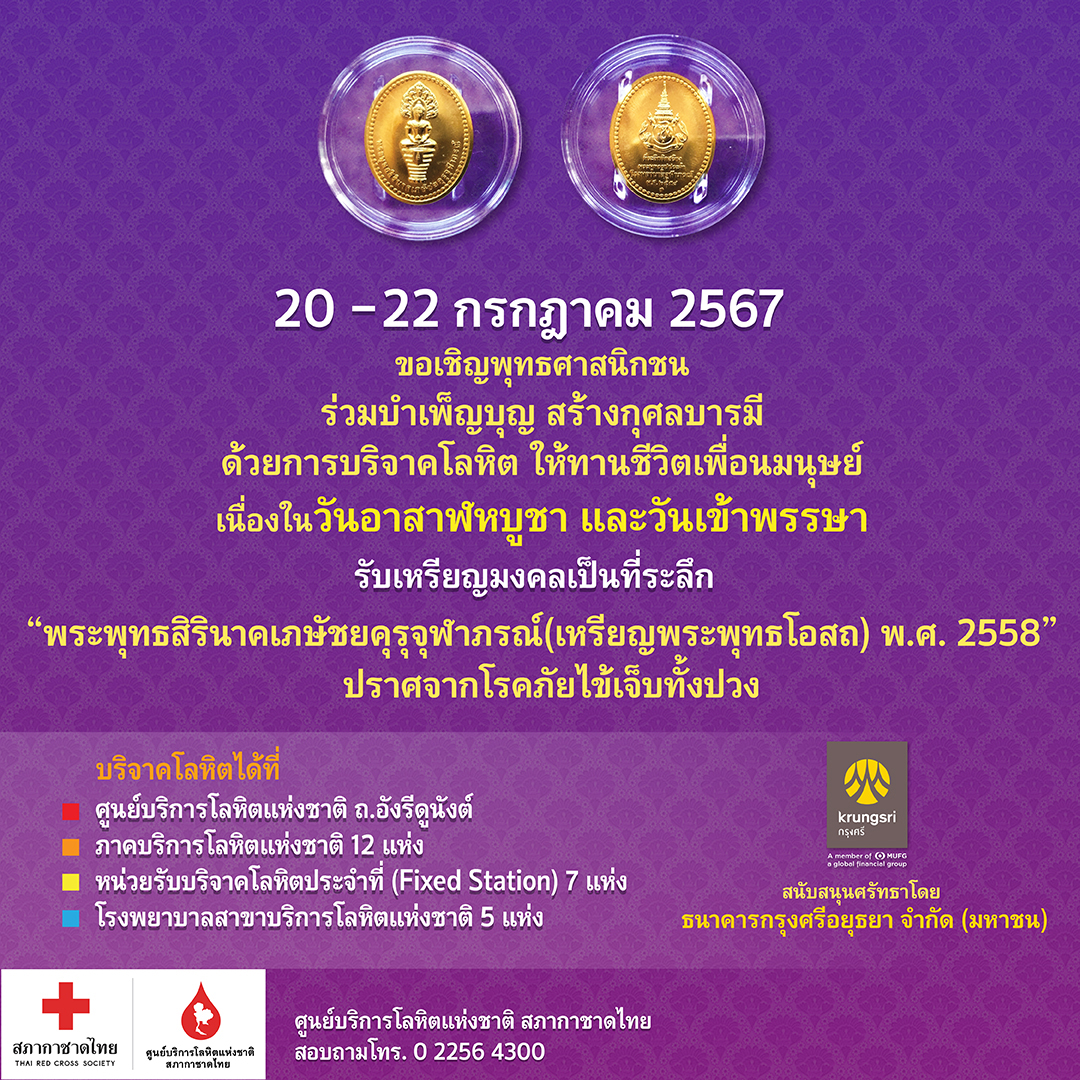 ศูนย์บริการโลหิตแห่งชาติ สภากาชาดไทย เชิญชวนชาวพุทธบำเพ็ญบุญ สร้างกุศลบารมี บริจาคโลหิต เนื่องในวันอาสาฬหบูชาและวันเข้าพรรษา ระหว่างวันที่ 20-22 กรกฎาคม 2567 ณ ศูนย์บริการโลหิตแห่งชาติ หน่วยรับบริจาคโลหิตประจำที่ (Fixed Station) 7 แห่ง ภาคบริการโลหิตแห่งชาติ 12 แห่งทั่วประเทศ และโรงพยาบาลสาขาบริการโลหิตแห่งชาติ 5 แห่ง ในกรุงเทพฯ ผู้บริจาคโลหิตจะได้รับเหรียญ“พระพุทธสิรินาคเภษัชยคุรุจุฬาภรณ์” (เหรียญพระพุทธโอสถ) เป็นที่ระลึก