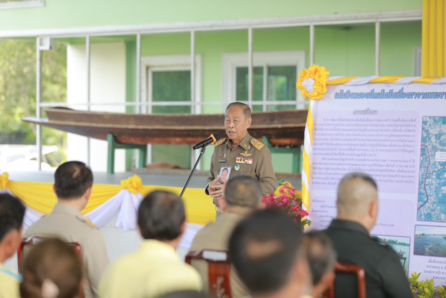 วันพุธที่ 16 ตุลาคม 2567 เวลา 09.15 น. พลอากาศเอก ชลิต พุกผาสุข องคมนตรี ประธานอนุกรรมการติดตามและขับเคลื่อนโครงการอันเนื่องมาจากพระราชดำริในพื้นที่ภาคกลาง พร้อมด้วย พลอากาศเอก จอม รุ่งสว่าง องคมนตรี รองประธานอนุกรรมการฯ นางพิชญดา หัศภาค รองเลขาธิการ กปร. และคณะอนุกรรมการฯ เดินทางไปติดตามผลการดำเนินงานโครงการพัฒนาพื้นที่แก้มลิงหนองเจ็ดเส้นอันเนื่องมาจากพระราชดำริ ตำบลสายทอง อำเภอป่าโมก จังหวัดอ่างทอง ซึ่งดำเนินโครงการตามพระราชดำริของพระบาทสมเด็จพระบรมชนกาธิกาเบศร มหาภูมิพลอดุลยเดชมหาราช บรมนาถบพิตร เพื่อบรรเทาปัญหาอุทกภัยซ้ำซากในพื้นที่อำเภอป่าโมก ซึ่งดำเนินการตั้งแต่ปี 2537 โดยขุดลอกพื้นที่แก้มลิง จำนวน 3 แห่ง และนำดินที่ขุดมาถมเป็นพื้นที่และทำสาธารณประโยชน์ ปัจจุบันมีการขุดเชื่อมพื้นที่แก้มลิงเข้าด้วยกัน จึงมีแก้มลิง จำนวน 2 บ่อ รวมพื้นที่ประมาณ 300 ไร่ ความจุ 1,467,200 ลูกบาศก์เมตร สามารถบรรเทาปัญหาอุทกภัยให้พื้นที่อำเภอป่าโมก จังหวัดอ่างทอง และช่วยเหลือพื้นที่เพาะปลูกในช่วงฤดูแล้ง จำนวน 2,000 ไร่