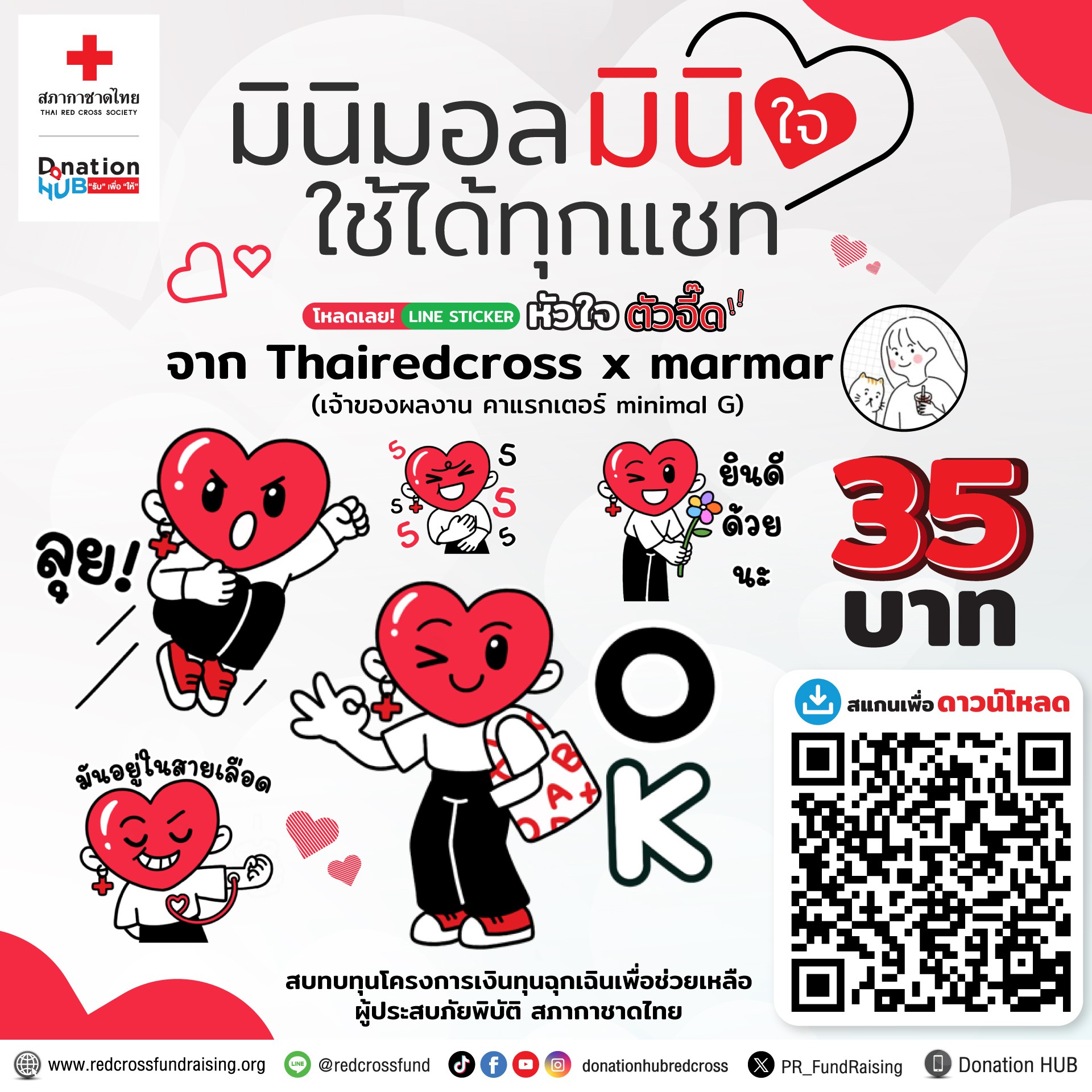 สภากาชาดไทย X Marmar จัดทำสติกเกอร์ไลน์คอลเลกชั่น “อิ่มใจ” สติกเกอร์สายมินิมอลที่ไม่ได้แค่ส่งความรู้สึกในแชต แต่ยังส่งต่อความช่วยเหลือให้กับผู้ประสบภัยพิบัติทั่วประเทศ จากแรงบันดาลใจของผู้ให้ที่เห็นว่าสิ่งที่เราให้เป็นประโยชน์ต่อผู้รับเราจะรู้สึกอิ่มอก อิ่มใจ คาแรกเตอร์หัวใจสีแดงสุดมินิมอลออกแบบโดย marmar เจ้าของผลงาน “minimal G” ที่หลายคนคุ้นเคยและยังได้รับรางวัล ครีเอเตอร์ดาวรุ่งแห่งปี 2024 จาก LINE STICKERS AWARDS