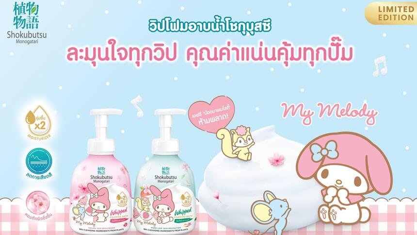 วิปโฟมอาบน้ำ นวัตกรรมฟองโฟมนุ่มจากประเทศญี่ปุ่น ทำให้รู้สึกสบายผิวขณะอาบน้ำ ไม่ทำให้ผิวแห้งตึง สร้าง brand movement ออกรุ่นลิมิเต็ด โชกุบุสซึ X My Melody มาใน 2 สูตรพิเศษ มอบผิวนุ่มพร้อมความหอมละมุนใจ ได้แก่ สูตร Sakura (Skin Brightening) ด้วยสารสกัดจากดอกซากุระช่วยให้ผิวกระจ่างใส เปล่งปลั่ง พร้อมกลิ่นหอมละมุน ล้างออกง่าย และ สูตร Momo Leaf (Skin Protection) ผสานพลังจากใบพืช MOMO Leaf และสาร IPMP ที่ช่วยลดการสะสมของแบคทีเรีย มอบผิวสะอาด นุ่มนวล มั่นใจได้ตลอดวัน