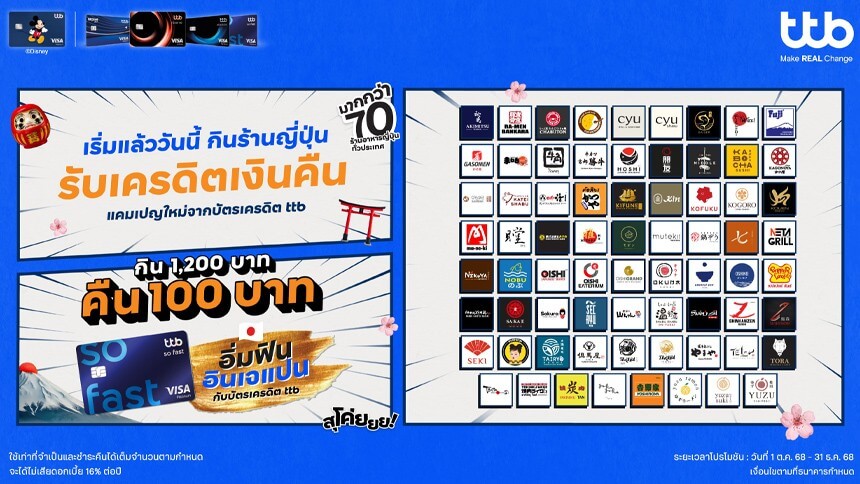 ทีเอ็มบีธนชาต หรือ ทีทีบี พร้อมเสิร์ฟความสุขเอาใจสายกินจริงจังให้ผู้ถือบัตรเครดิต ttb บัตรเครดิต ttb Global House และบัตรเครดิต ttb Disney ได้อิ่มอร่อยแบบจัดเต็มกับแคมเปญ “อิ่มฟิน อินเจแปน” กิน 1,200 บาทขึ้นไป / เซลล์สลิป รับเครดิตเงินคืน 100 บาท (จำกัดเครดิตเงินคืน 100 บาท / เซลล์สลิป และสูงสุด 400 บาท / ท่าน ตลอดรายการ) กับร้านอาหารญี่ปุ่นชื่อดังทั่วประเทศมากกว่า 70 ร้าน ให้ทุกมื้อเต็มไปด้วยความสุข ตอบทุกโจทย์ทุกความชอบ ทั้งซูชิ ราเมน ชาบู ปิ้งย่าง หรือบุฟเฟต์ คนรักอาหารญี่ปุ่นไม่ควรพลาด อิ่มอร่อย ได้ตั้งแต่วันที่ 1 ตุลาคม 2568 – 31 ธันวาคม 2568 สามารถศึกษารายละเอียดเพิ่มเติมของโปรโมชันได้ที่ https://www.ttbbank.com/th/promotion/credit-card/dining/japanese-theme-oct25