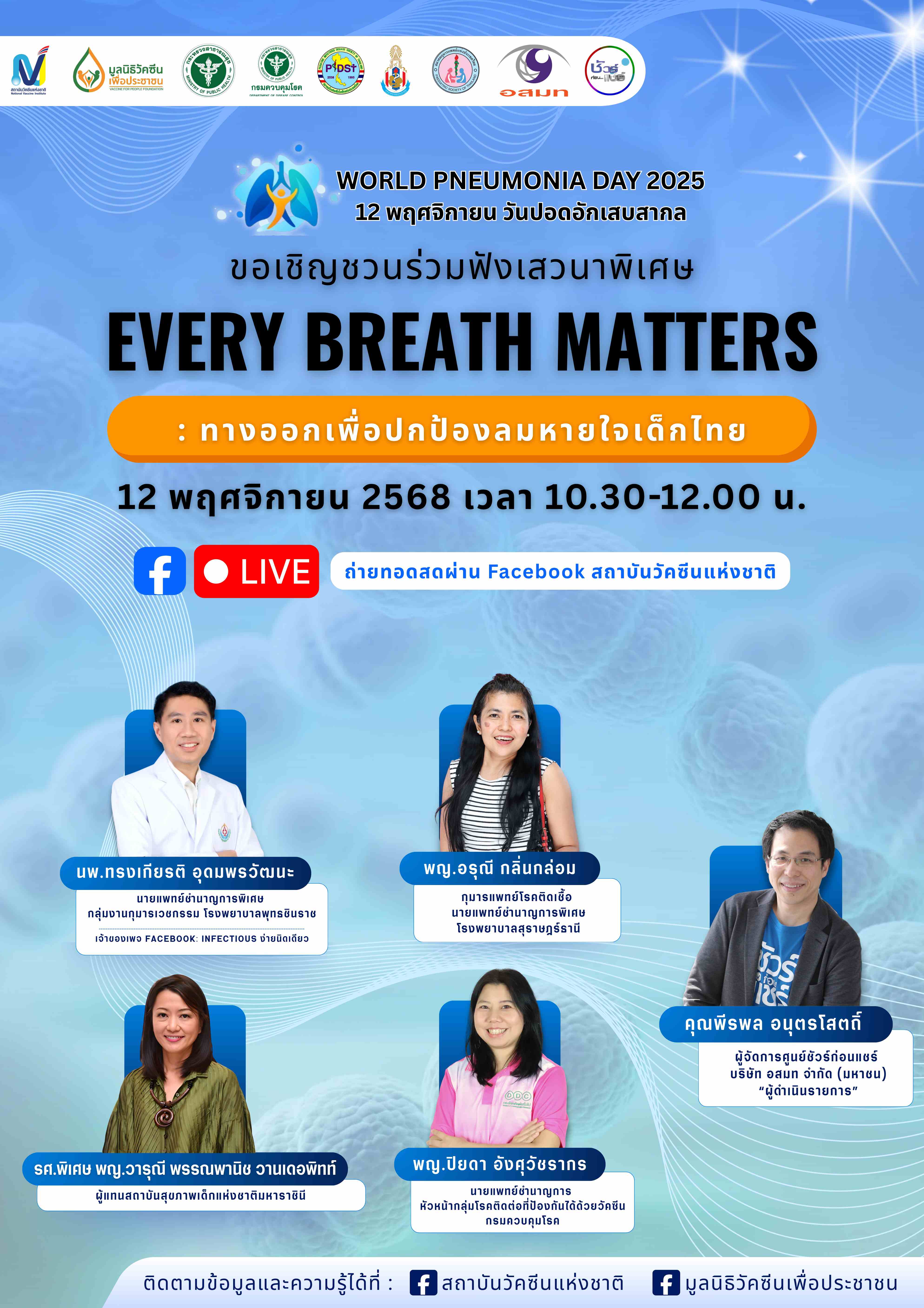 สถาบันวัคซีนแห่งชาติ จึงร่วมกับ มูลนิธิวัคซีนเพื่อประชาชน กรมควบคุมโรค ราชวิทยาลัยกุมารแพทย์แห่งประเทศไทย สมาคมกุมารแพทย์แห่งประเทศไทย และสมาคมโรคติดเชื้อในเด็กแห่งประเทศไทย จัดงาน World Pneumonia Day 2025 - Stop Pneumonia, Save Lives เด็กไทยต้องปลอดภัยจากโรคร้ายที่ป้องกันได้ด้วยวัคซีน" เพื่อรณรงค์สร้างความตระหนักรู้ถึงความรุนแรงของโรคปอดอักเสบและความสำคัญของการเข้าถึงวัคซีนป้องกันโรคปอดอักเสบในเด็กเล็ก เพื่อให้ “ทุกลมหายใจของเด็กไทย” เติบโตไปอย่างปลอดภัยและแข็งแรง และไม่ต้องเสี่ยงกับโรคที่ป้องกันได้ด้วยวัคซีน เนื่องในวันปอดอักเสบสากล ในวันที่ 12 พฤศจิกายน 2568 เวลา 09.00-12.00น. ณ ห้องออดิทอเรียม ชั้น 6 อาคารปฏิบัติการวิทยุโทรทัศน์ บริษัท อสมท จำกัด (มหาชน)