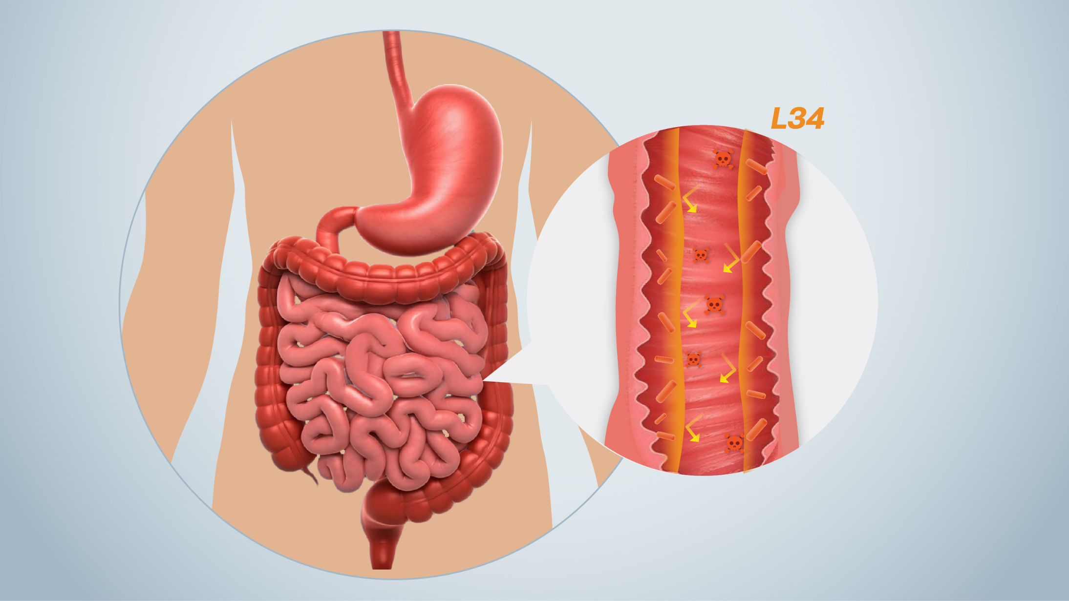 L34 มีบทบาทสำคัญในการดูแลสุขภาพลำไส้ โดยเฉพาะผู้ที่มีภาวะ “ลำไส้รั่ว” (Leaky Gut Syndrome) ซึ่งเกี่ยวข้องกับโรคเรื้อรัง ภูมิแพ้ และภูมิคุ้มกันผิดปกติ