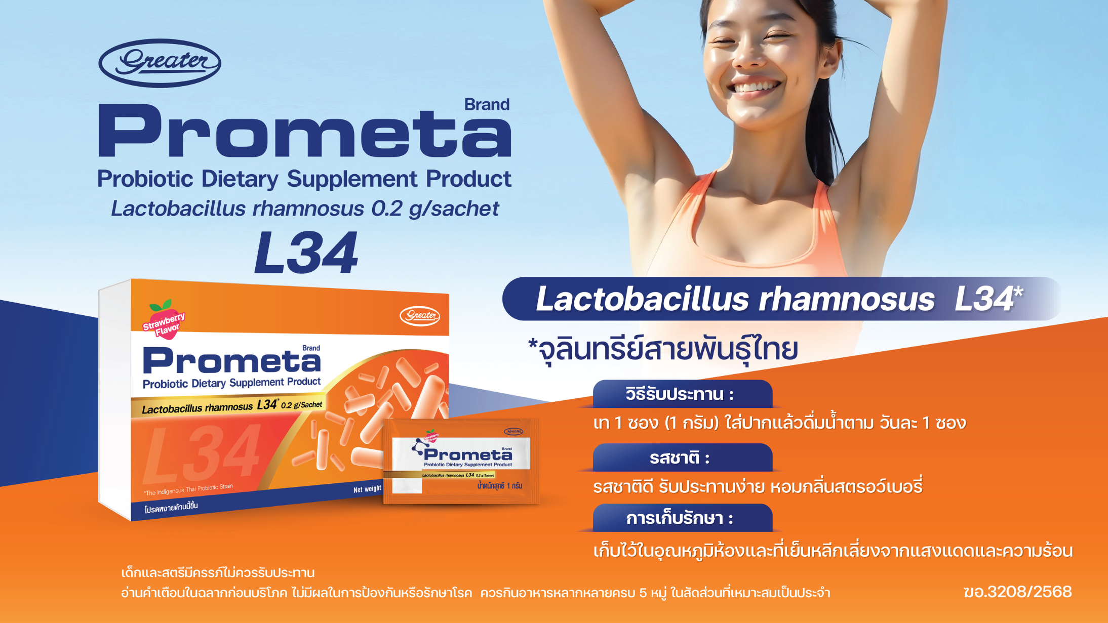 ในวาระก้าวเข้าสู่ปีที่ 60 ของกลุ่มบริษัท เกร๊ทเตอร์ฟาร์ม่า จำกัด ผู้เชี่ยวชาญด้านการดูแลสุขภาพและเป็นผู้ผลิต ผลิตภัณฑ์เวชภัณฑ์คุณภาพของไทย บริษัทได้ประกาศเปิดตัวผลิตภัณฑ์ใหม่ล่าสุด “GREATER PROMETA L34” ผลิตภัณฑ์โพรไบโอติกสายพันธุ์ไทยที่พัฒนาจากงานวิจัยโดยหมอไทย เพื่อสุขภาพของคนไทยโดยเฉพาะ ตอกย้ำพันธกิจขององค์กรในการ “ก้าวสู่ 60 ปี อย่างมั่นคงและยั่งยืน” ด้วยการขับเคลื่อนนวัตกรรมสุขภาพที่มีงานวิจัยรองรับ