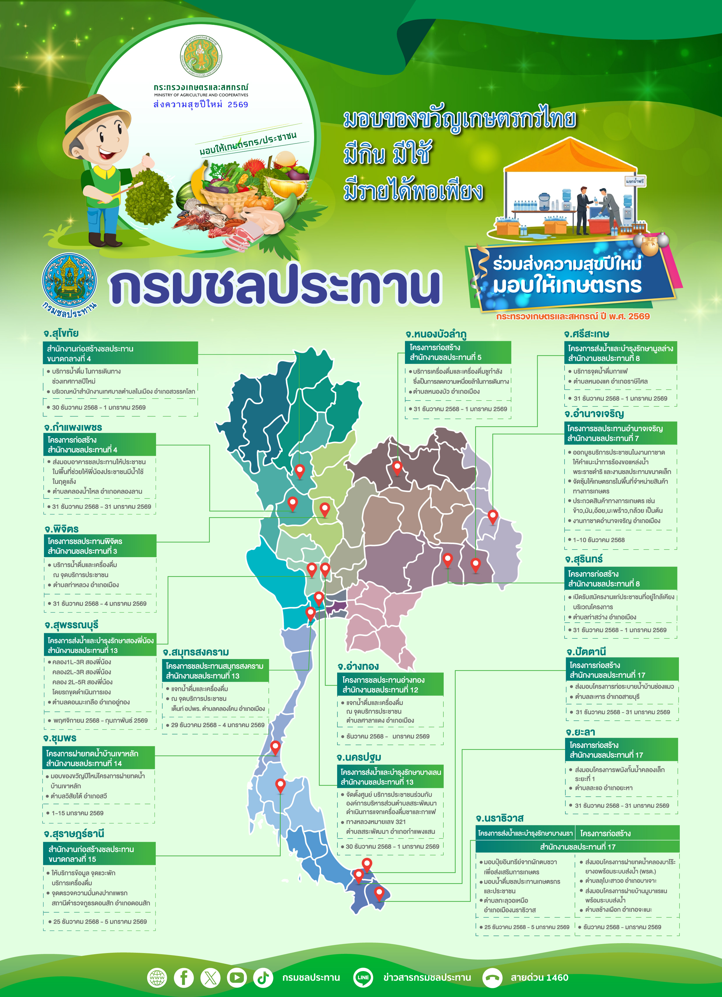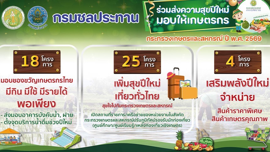 นายสุริยพล นุชอนงค์ อธิบดีกรมชลประทาน เปิดเผยว่า กระทรวงเกษตรและสหกรณ์ได้มอบนโยบายให้หน่วยงานในสังกัด ร่วมกันจัดกิจกรรมส่งความสุขปีใหม่ ประจำปี 2569 เพื่อมอบของขวัญแก่ประชาชนและเกษตรกรไทย ทั้งในรูปแบบของการพัฒนาระบบชลประทาน การส่งเสริมคุณภาพชีวิต และการเปิดแหล่งท่องเที่ยวเชิงเรียนรู้ เป็นของขวัญต้อนรับปีใหม่แก่พี่น้องชาวไทยทั่วประเทศ