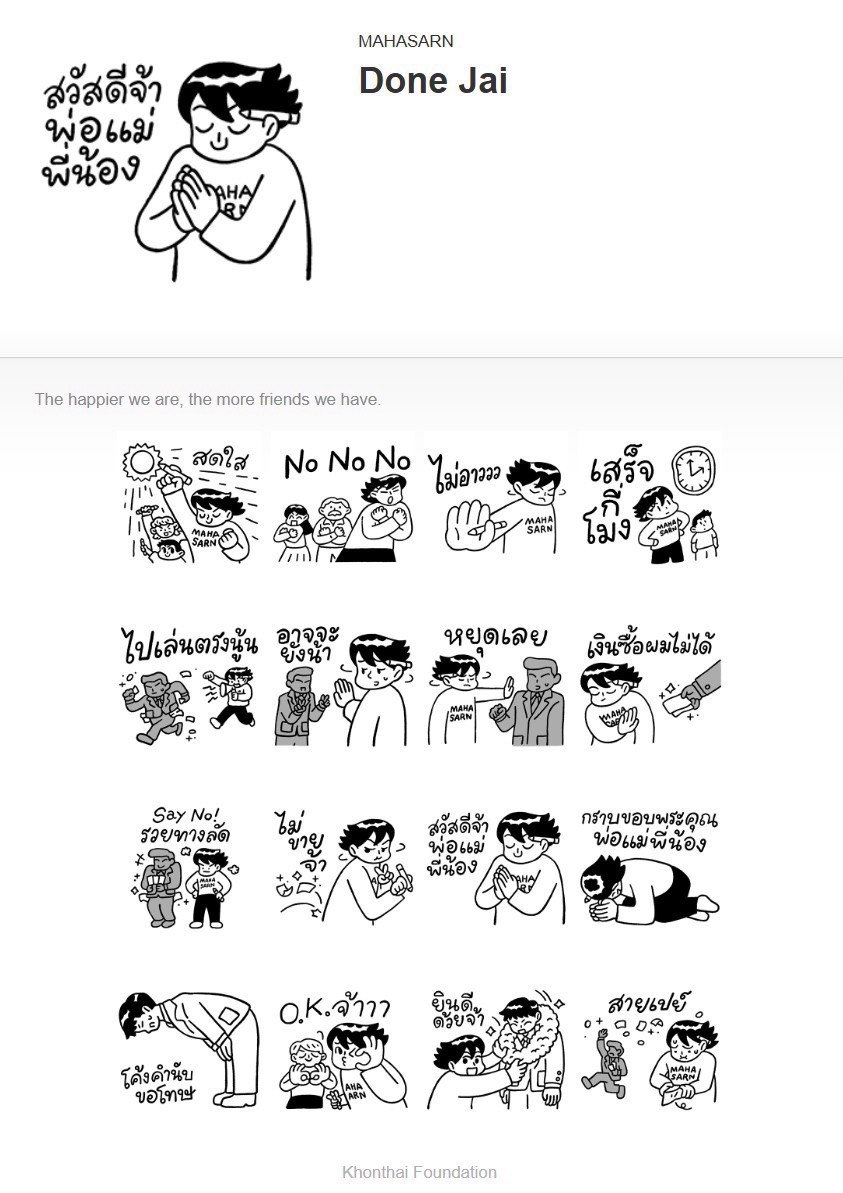 นอกจากนั้น ยังมี LINE Sticker ชุด 1 สิทธิ์เช่นกันชื่อ “Done Jai-โดนใจ” สามารถดาวน์โหลดจากลิงค์นี้ https://store.line.me/stickershop/product/32699969/th โดยทั้งสองชุดจะมี รูปคาแรกเตอร์เหมือนกัน แต่ชุดโดนใจตัวข้อความจะปรับเปลี่ยนให้สอดคล้องตามข้อกำหนดของ LINE Sticker และจัดจำหน่ายในราคา 31 บาท หรือ 50คอยต์ ต่อการดาวน์โหลด 1 ครั้ง รายได้ที่เกิดขึ้นจะนำไปใช้ในการขับเคลื่อนงานต่อต้านคอร์รัปชันต่อไป