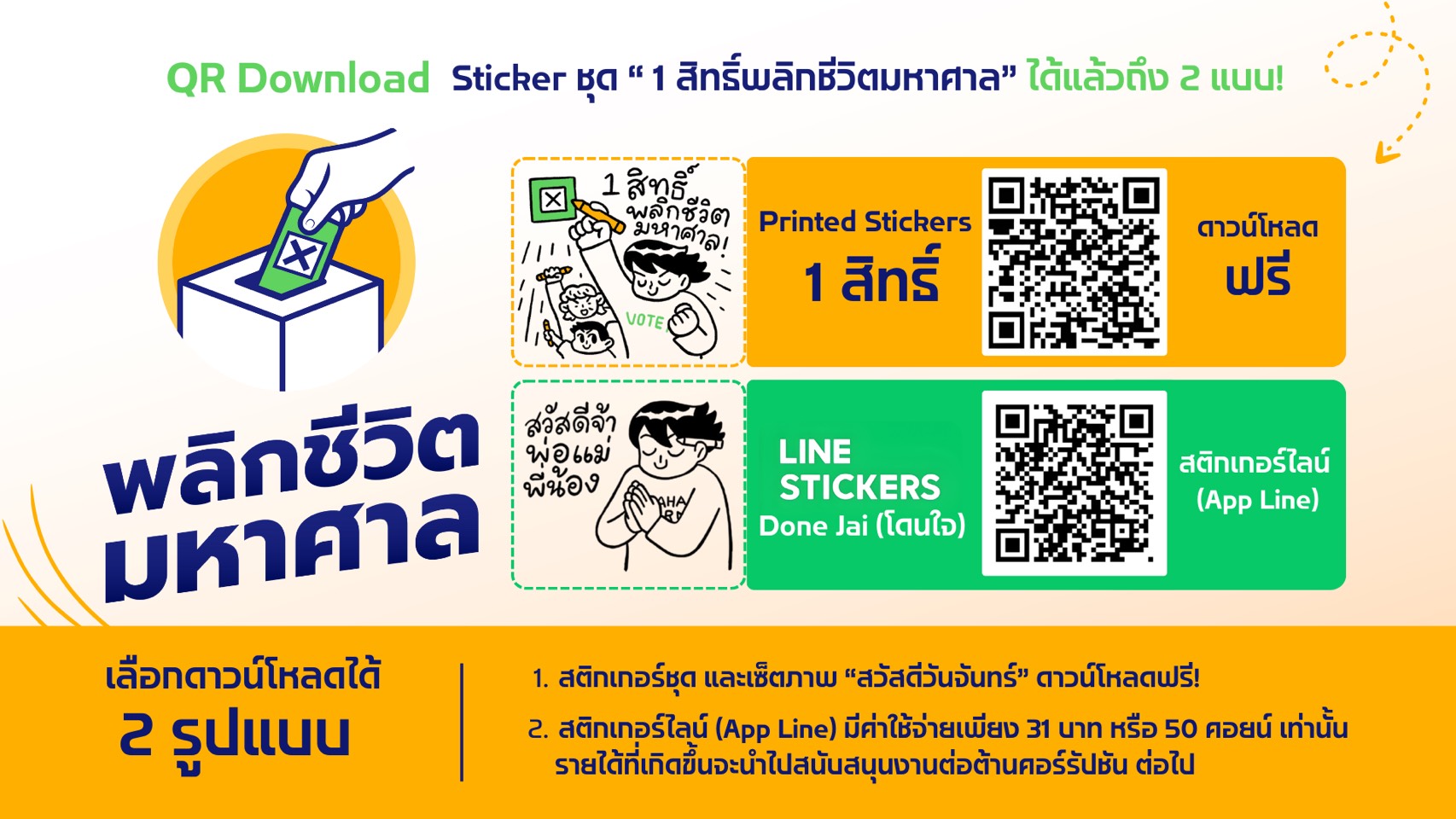 นายสุภอรรถ โบสุวรรณ ผู้ร่วมก่อตั้ง แฮนด์ วิสาหกิจเพื่อสังคม ตัวแทนภาคีเครือข่ายพลิกชีวิตมหาศาล กล่าวว่า เพื่อเป็นการตอกย้ำเสียงประชาชนให้นักการเมือง/พรรคการเมืองขานรับหรือได้ยินชัดเจนมากขึ้น ภาคีเครือข่ายพลิกชีวิตมหาศาลจึงได้ริเริ่มสร้างสรรค์สติกเกอร์ชุด “1สิทธิ์พลิกชีวิตมหาศาล” เพื่อเป็นเครื่องมือสื่อ 10 สารหลัก ภายใต้แก่นคิด “ไม่ต้านโกง = ไม่เลือก” ประกอบด้วย