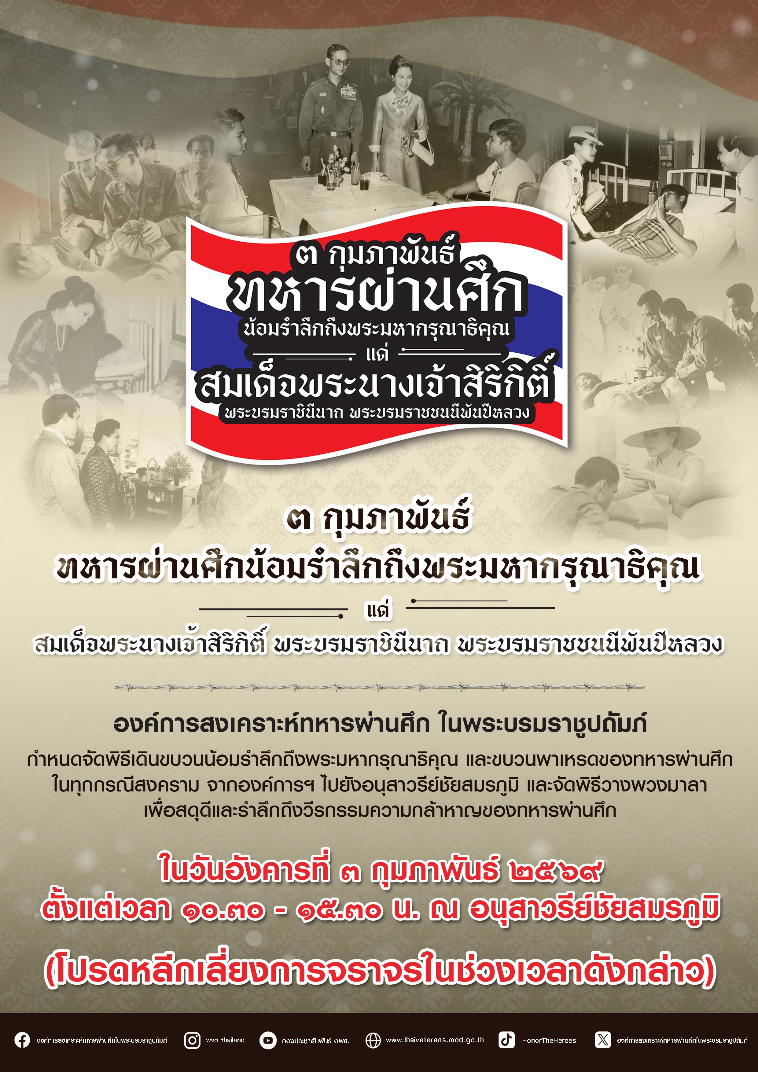องค์การสงเคราะห์ทหารผ่านศึกฯ กําหนดจัดพิธีเนื่องในวันทหารผ่านศึก 3 กุมภาพันธ์ 2569 “๓ กุมภาพันธ์ทหารผ่านศึกน้อมรําลึกถึงพระมหากรุณาธิคุณ แด่สมเด็จพระนางเจ้าสิริกิติ์ พระบรมราชินีนาถ พระบรมราชชนนีพันปีหลวง”