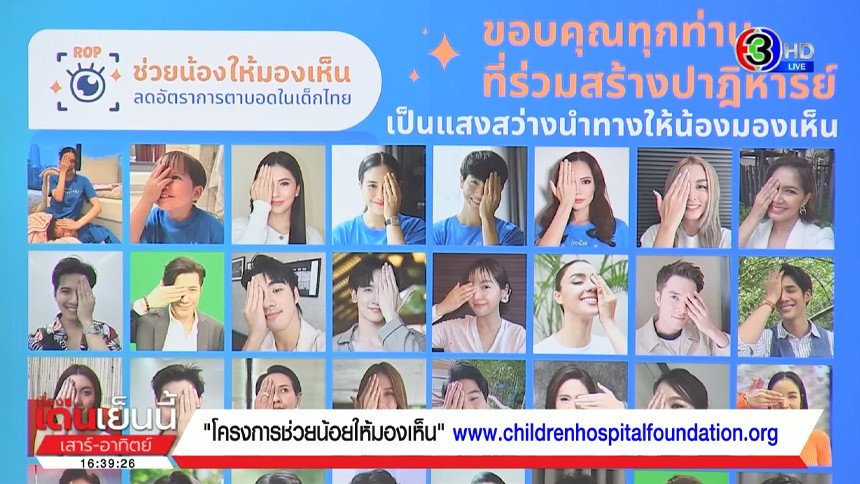 เมื่อวันศุกร์ที่ผ่านมา สถาบันสุขภาพเด็กแห่งชาติมหาราชินี หรือโรงพยาบาลเด็ก เปิด"โครงการช่วยน้องให้มองเห็น"โดยช่อง 3 ระดมศิลปินและผู้สนับสนุนร่วมสร้างปาฎิหาริย์