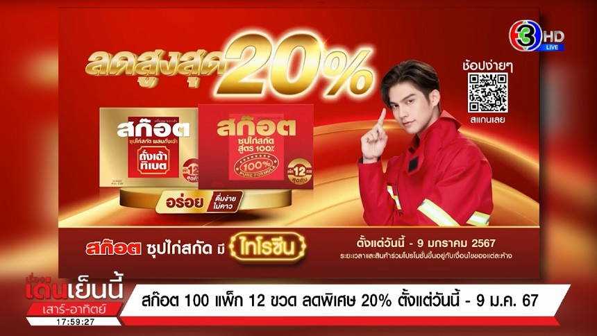 วันนี้มีโปรเด็ดๆ ส่งท้ายปี ให้ไปใส่ใจตัวเอง มาบอกกัน สก๊อต 100 ซุปไก่สกัด สูตร 100% และ สก๊อต ซุปไก่สกัดผสมถั่งเฉ้า ขนาด 40 มิลลิลิตร แพ็ก 12 ขวด ลดพิเศษ 20% ที่ ห้างสรรพสินค้าชั้นนำที่ร่วมรายการทุกสาขา