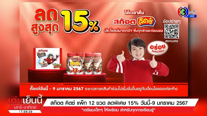 สก๊อต ซุปไก่สกัดสูตรร้อย เปอเซ็นต์ และ สก๊อต คิตซ์ ซุปไก่สกัดผสมนม ทุกขนาด ทุกรสชาติ แพ็ก 12 ขวด ลดพิเศษ 15% ที่ห้างสรรพสินค้าชั้นนำที่ร่วมรายการ ตั้งแต่วันนี้ ถึง 9 มกราคม 2567 นี้ หรือ scan ซื้อง่ายๆ ตาม QR Code ที่ขึ้นหน้าจอนี้ได้เลยครับ