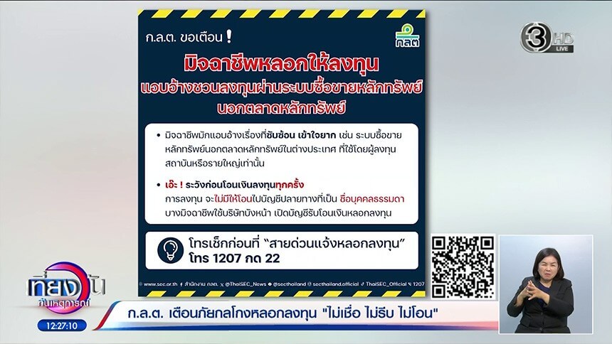 และหากต้องการคำปรึกษา หรือ คิดว่าตนเองกำลังถูกหลอก สามารถโทรปรึกษา ก.ล.ต. ได้ที่ สายด่วนแจ้งหลอกลงทุน 1207 กด 22