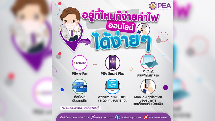 การไฟฟ้าส่วนภูมิภาค (PEA) ห่วงใยผู้ใช้ไฟฟ้าในสถานการณ์แพร่ระบาดเชื้อโควิด-19 แนะนำให้ผู้ใช้ไฟฟ้าชำระค่าไฟฟ้าผ่านทางช่องทางออนไลน์ เพื่อเป็นการลดการแพร่ระบาดและป้องกันการติดเชื้อโควิด-19 โดยไม่ต้องเดินทางมาติดต่อที่สำนักงานการไฟฟ้าส่วนภูมิภาค ซึ่งผู้ใช้ไฟฟ้าสามารถเลือกชำระค่าไฟฟ้าผ่านทางออนไลน์ ดังนี้
