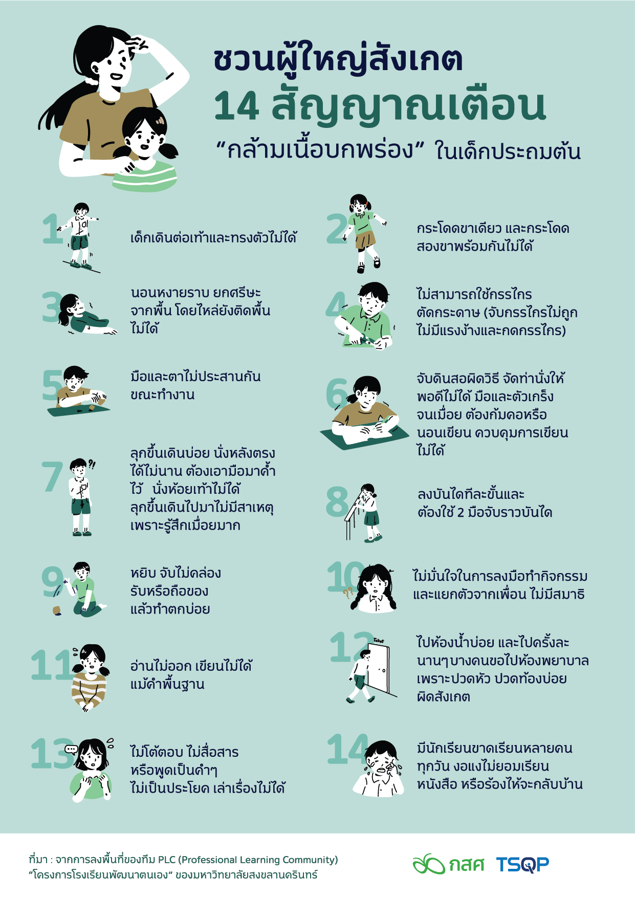 มาช่วยกันสังเกตว่าลูกๆ หลานๆ ว่ามีลักษณะแบบนี้ไหม เช่น ท่าทางจับดินสอผิดวิธี มือและตัวเกร็งจนเมื่อย ต้องก้มคอ นอนเขียน ควบคุมการเขียนไม่ได้ มือและตาไม่ประสานกัน ขณะทำงาน พูดเป็นคำๆ ไม่เป็นประโยค , เล่าเรื่องไม่ได้ , เด็กเดินต่อเท้า และทรงตัวไม่ได้,กระโดดขาเดียว และกระโดดสองขาพร้อมกันไม่ได้