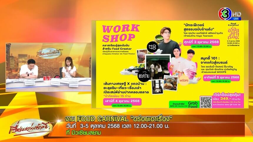 เทศกาลอาหารดีที่สุด อร่อยที่สุด ว้าวที่สุด งาน 'Food Carnival อร่อยเอาเรื่อง' บรรยากาศปิกนิกในสวนใจกลางเมือง กินดื่มสุดฟินกับ 40 ร้านดัง ร้านเด็ด ที่ไม่เคยออกงานที่ไหนมาก่อน รวมถึงร้านรางวัลการันตี ร้านไวรัลต่อคิวยาว และมีกิจกรรมอีกเพียบ ที่มิวเซียมสยาม ระหว่างวันที่ 3-5 ตุลาคม 2568 ตั้งแต่เวลา 12.00-21.00 น.