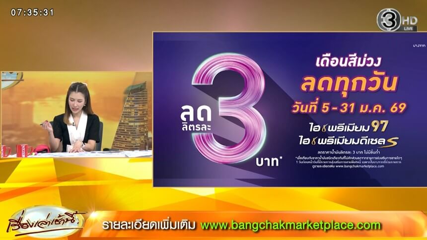 เมื่อเติมน้ำมันบางจากไฮพรีเมียม 97 หรือบางจากไฮพรีเมียมดีเซล S ลดลิตรละ 3 บาท ไม่มีขั้นต่ำ ตั้งแต่วันที่ 5-31 มกราคม 2569 ลดทั้งเดือน * เมื่อเทียบกับราคาน้ำมันชนิดเดียวกันที่ไม่หักส่วนลดจากรายการส่งเสริมการขายใด ๆ 1 วันก่อนหน้าวันที่มีรายการส่งเสริมการขายพิเศษนี้ในแต่ละคราว