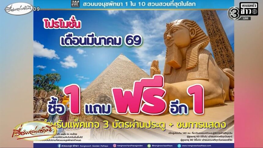 'สวนนงนุชพัทยา' ขยายเวลาโปรโมชั่น 'มาคู่ คุ้มกว่า' ซื้อบัตรผ่านประตู พร้อมบัตรชมการแสดง 1 ใบ รับฟรีอีก 1 ใบ ตลอดเดือนมีนาคม