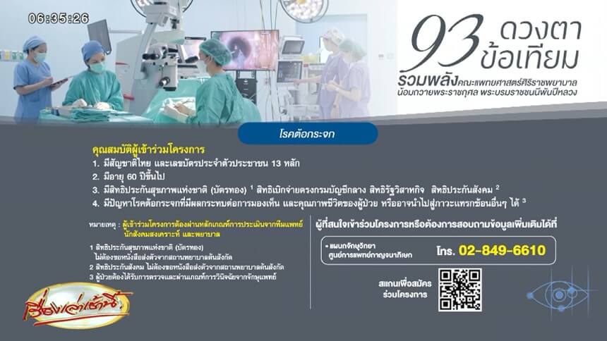 โรงพยาบาลศิริราช และศูนย์การแพทย์กาญจนาภิเษก คณะแพทยศาสตร์ศิริราชพยาบาล มหาวิทยาลัยมหิดล ผนึกกำลังครั้งยิ่งใหญ่ จัดแถลงข่าวโครงการ “93 ดวงตา 93 ข้อเทียม รวมพลังคณะแพทยศาสตร์ศิริราชพยาบาล น้อมถวายพระราชกุศลแด่ สมเด็จพระนางเจ้าสิริกิติ์พระบรมราชินีนาถ พระบรมราชชนนีพันปีหลวง” ภารกิจผ่าตัดต้อกระจก 93 ดวงตา และเปลี่ยนข้อเข่า – ข้อสะโพกด้วยหุ่นยนต์ช่วยผ่าตัด จำนวน 93 ข้อ ช่วยเหลือผู้สูงอายุด้อยโอกาส เพื่อยกระดับคุณภาพชีวิตของผู้ป่วย ให้สามารถเข้าถึงการรักษาถวายเป็นพระราชกุศล