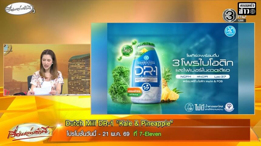 Dutch Mill DR-1 โยเกิร์ตพร้อมดื่ม ที่มีโพรไบโอติก 3 สายพันธุ์ และพรีไบโอติก 2 ชนิด อย่าง Inulin และ FOS ปราศจากน้ำตาลแลคโตส ไม่เติมสารให้ความหวาน มี 3 สูตร คือ สูตร Original เข้มข้น ไม่เติมน้ำตาลเพิ่ม, สูตร Mild & Mellow ดื่มง่าย กลมกล่อม และรสชาติใหม่ Kale & Pineapple ที่เสริมผักเคลกับน้ำสับปะรด ทั้ง 3 สูตร ได้รับสัญลักษณ์ทางเลือกสุขภาพ