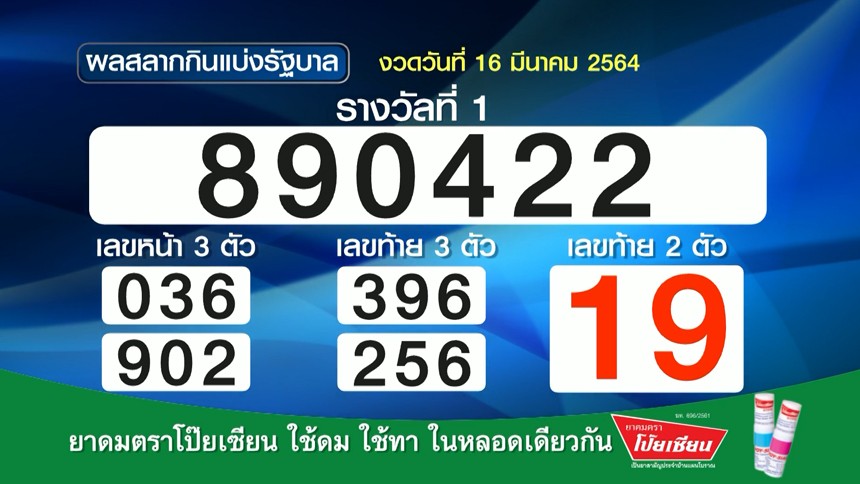ผลสลากกินแบ่งรัฐบาล งวดวันที่ 16 มีนาคม 2564