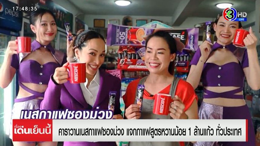 เนสกาแฟจัดกิจกรรม คาราวานเนสกาแฟซองม่วง หวานน้อย อร่อยมาก เดินสายทั่วประเทศ ปักหมุดร้านโชว์ห่วยที่มีเนสกาแฟซองม่วงจำหน่าย พร้อมแจกกาแฟให้ชิมกันทั่วประเทศ 1 ล้านแก้ว การันตีไม่ว่าจะไปร้านโชว์ห่วยร้านไหน คุณก็จะเจอเนสกาแฟซองม่วงได้ทั่วประเทศ