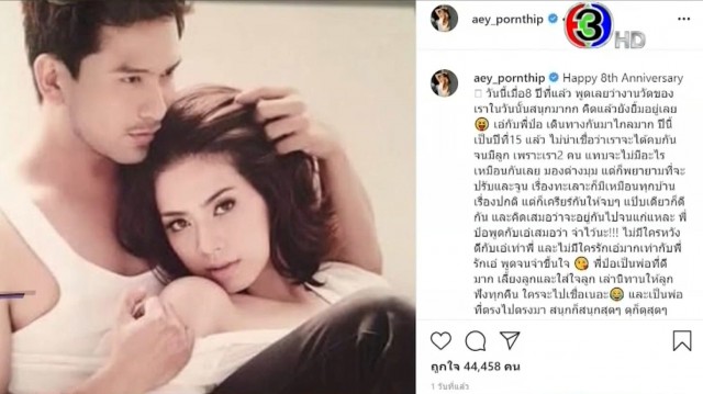 “Happy 8th Anniversary วันนี้เมื่อ 8 ปีที่แล้ว พูดเลยว่างานวัดของเราในวันนั้นสนุกมาก คิดแล้วยังยิ้มอยู่เลย เอ๋กับพี่ป๋อ เดินทางกันมาไกลมาก ปีนี้เป็นปีที่15 แล้ว ไม่น่าเชื่อว่าเราจะได้คบกันจนมีลูก เพราะเรา 2 คน แทบจะไม่มีอะไรเหมือนกันเลย มองต่างมุม แต่ก็พยายามที่จะปรับและจูน เรื่องทะเลาะก็มีเหมือนทุกบ้าน เรื่องปกติ แต่ก็เครียร์กันให้จบๆ แป๊บเดียวก็ดีกัน และคิดเสมอว่าจะอยู่กันไปจนแก่แหละ