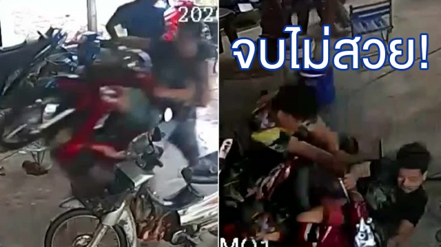 คลิปวัยรุ่นเบิ้ลเครื่องโชว์เพื่อน พลาดพุ่งเข้าชนอู่ซ่อมรถ