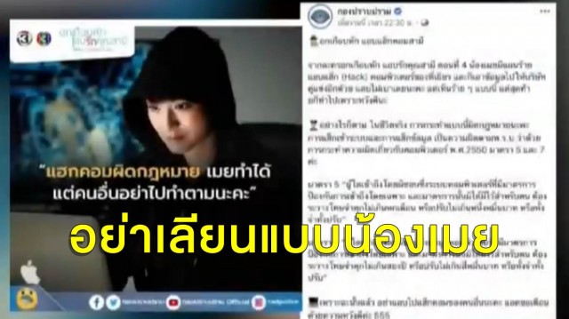 กองปราบฯ เตือนเลียนแบบ 'น้องเมย' แฮกคอมพ์ 'พี่เธียร' ในชีวิตจริงมีสิทธิติดคุก
