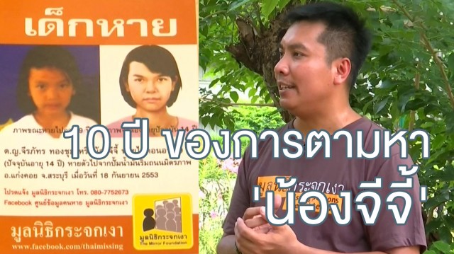 เด็กหญิงจีรภัทร ทองชุม หรือ น้องจีจี้ หายไปเมื่อวันที่ 18 กันยายน 2553 บริเวณหน้าปั้มน้ำมันแห่งหนึ่งใน อำเภอแก่งคอย จังหวัดสระบุรี อายุขณะหายไป 9 ขวบ อีกไม่กี่วันจะครบ 10 ปีแล้ว ที่เด็กหญิงคนนี้หายไป คุณกิตติ สิงหาปัด สัมภาษณ์พิเศษ คุณเอกลักษณ์ หลุ่มชมแข หัวหน้าศูนย์ข้อมูลคนหาย มูลนิธิกระจกเงา ผู้ที่ติดตามเรื่องนี้มาตลอด 10 ปี