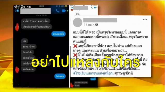 มีการแชร์แชทของครูผู้ชายโรงเรียนเอกชนชื่อดังแห่งหนึ่งใน จ.สุราษฎร์ธานี กับนักเรียนชายชั้นมัธยมปลายรายหนึ่งซึ่งเป็นลูกศิษย์ ลักษณะเชิงขอกระทำอนาจาร เพื่อแลกเกรดหรือสอบผ่าน ทั้งที่ทำข้อสอบตอบเหมือนเพื่อนที่สอบผ่าน