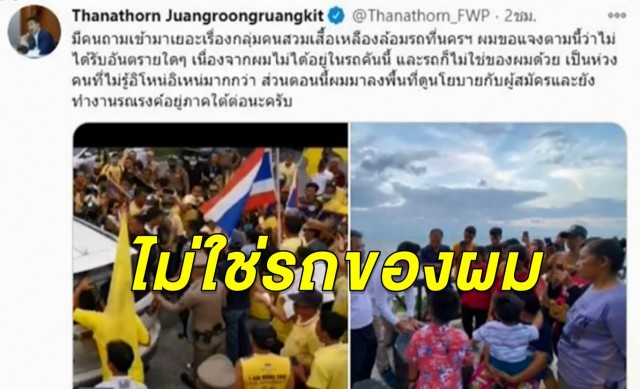 กลุ่มคนเสื้อเหลือง เมืองคอน ฮือล้อมรถตามหา 'ธนาธร' เจ้าตัวโพสต์แจงไม่ได้อยู่บนรถคันนั้น
