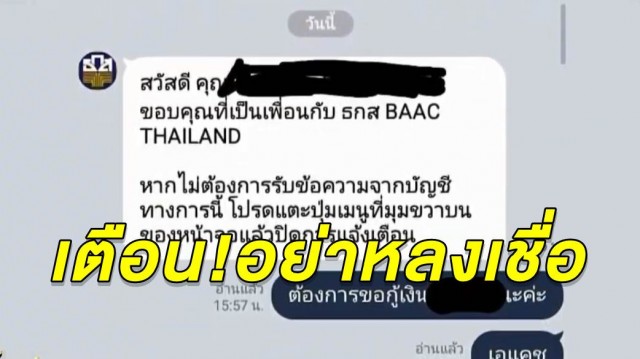"# ฝากเตือนไว้เป็นอุทาหรณ์ค่ะ เมื่อวานเวลาประมานเกือบบ่าย 4 โมงเย็น มีไลน์แอบอ้างเป็นธนาคาร ธ.ก.ส. (ขอเปิดเผยชื่อธนาคาร) ส่งข้อความมาขอเลขบัตรประชาชน หน้า-หลังบัตรเครดิต (ไทยพาณิชย์) สอบถามเงินที่เหลือในบัญชีแต่ละธนาคาร เลขเข้าแอปธนาคาร 6 หลัก รวมทั้งขอรหัส OTP เพื่อเข้าไปขโมยเงินในบัญชี ซึ่งในบัญชี ธ.ก.ส.ไม่มีเงิน แต่ในไทยพาณิชย์มีเงิน