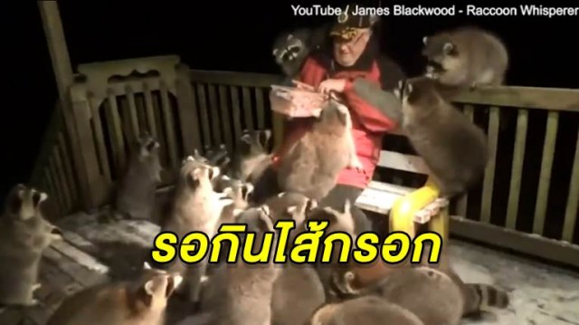 แคนาดา-โลกโซเชียลแห่แชร์คลิป คุณตาชาวแคนาดาป้อนไส้กรอกให้ฝูงแรคคูนตัวอ้วน ซึ่งเป็นฝูงแรคคูนตามธรรมชาติ ที่มานั่งรอคุณตา โดยพบว่าคุณตาทำแบบนี้มา 20 ปีแล้ว